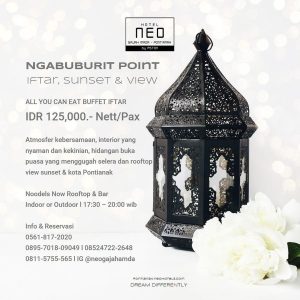 Hanya Rp125,000 per orang, kita sudah bisa menikmati berbagai takjil, hidangan lezat, stall dan live cooking serta berbagai kue dan minuman segar sepuasnya. Jadi jangan ragu lagi untuk Ngabuburit dan Buka Puasa Bersama di Hotel Neo Gajah Mada Pontianak.